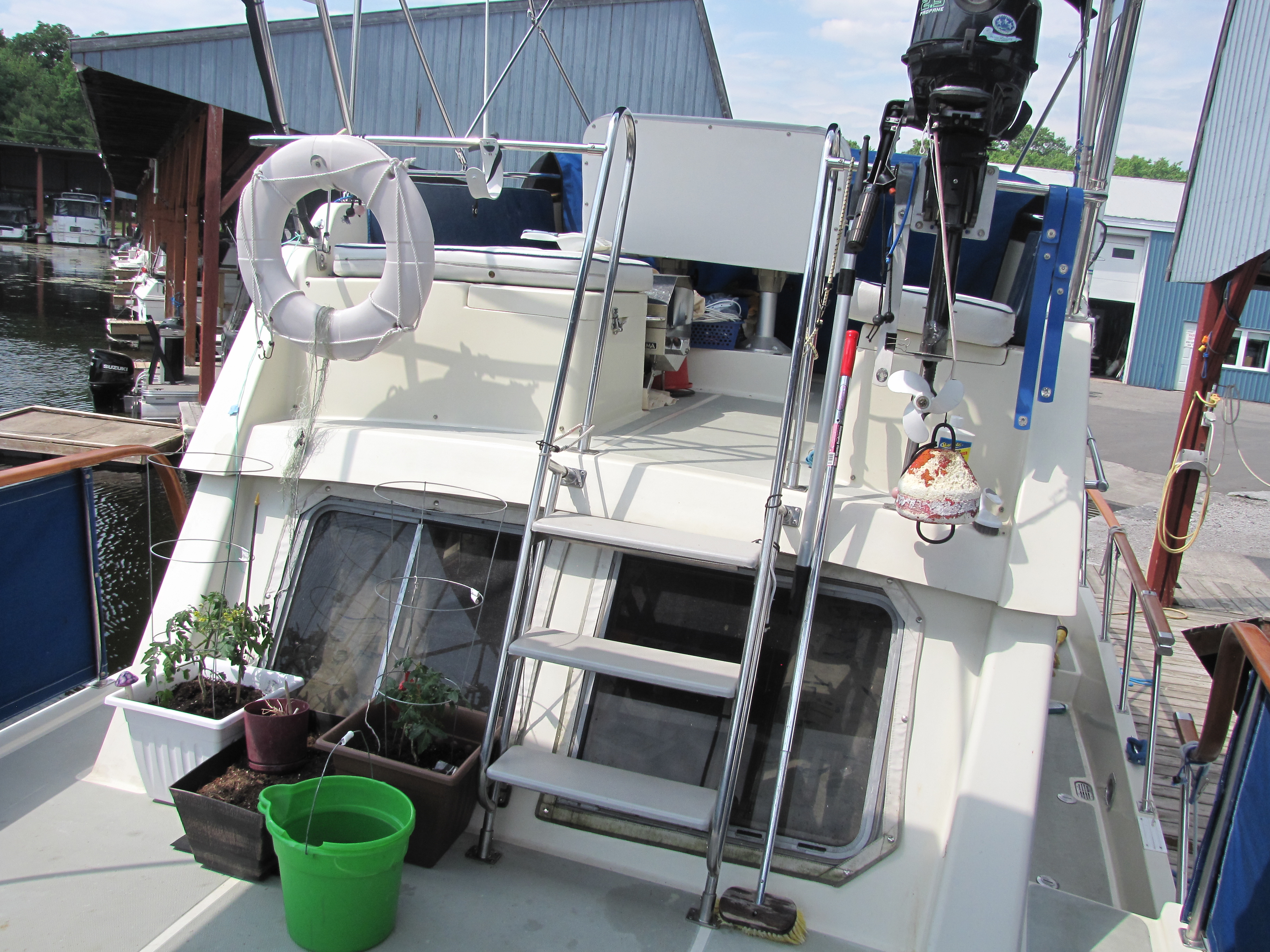 In the afternoon Cindy from the canvas shop, added more support braces on the canopy for the solar panels. Andy, Todd from the marina and Karl worked on the boat until after 9pm, had a few issues with fuses blowing but seemed to get the systems working and communicating. Karl installed software on Andy’s phone for monitoring the system. Next week, a monitor will be installed on the boat, for easy viewing by both of us. On Wednesday morning, after a little more grocery shopping in Bancroft, we departed for the boat with all our stuff. After unloading the car, I cleaned up after the last two days of renovations in the boat. I then washed the deck and flybridge. I then planted my garden, two tomatoes plants that I had started back in Winnipeg at the end of February. They both have flowers on them already, so hopefully we will have tomatoes before to long. I also planted some radish and cucumber seeds.