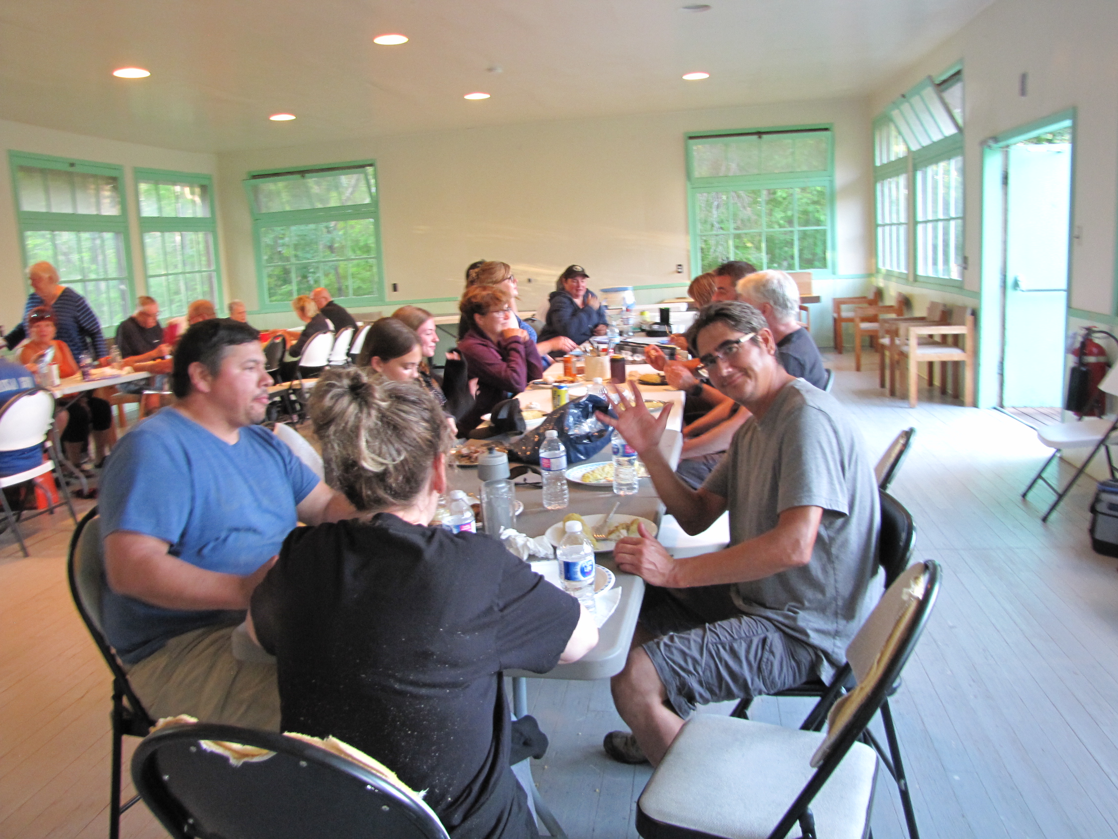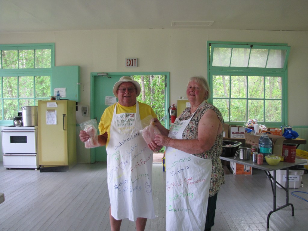 We filled up the fridge and freezer and dumped off our golf clubs and the other stuff that was in the trunk. We then went in search of Park staff to let them know what we had done, and then headed back to Winnipeg, to pack up for trip number two. We arrived the second time around 3:15 and took our stuff to our cabin, which had been cleaned since our first visit. This time I sat on the bed, and found out that it wasn’t much softer than sleeping on the floor, had I known this I could have brought a mattress topper. We then went to the Rec hall, and unpacked food items. Everyone was assembling there, and we were given our assignments for the week. Jack arrived around supper time, he will be staying with us for the reunion and sleeping on the futon in our cabin. My crew, was responsible for cleanup after dinner, which was Chili and buns. Our first dilemma was that the rec hall did not have a sink or running water. We were able to heat water in a huge pot over the propane burner, to use for washing dishes.