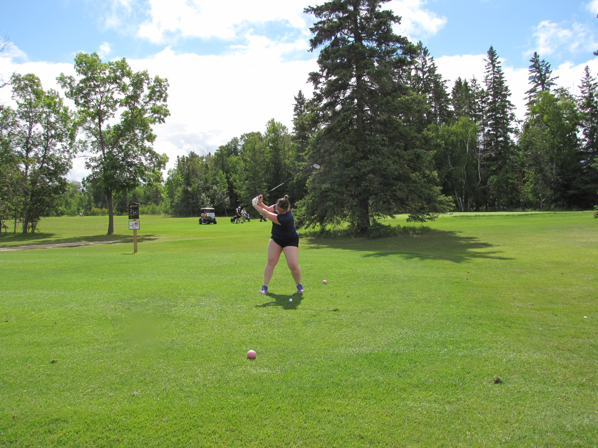 After supper, there was the fun facts competition. Each person at the reunion had submitted a fun fact about themselves that wasn’t to be shared. Everyone was placed on a team, given the list of facts and were given 17 minutes, to try and figure out which fun fact belonged to which person. You had approach people and confirm a fun fact by asking and they had to be truthful. Our team was not the winners here. On Wednesday morning at 11:30, the golf tournament was being held at Marvellous meadows in Arnes, which was only about a 10 minute drive from Camp Morton. Andy was looking after this event- there were 24 participants, assigned to 5 teams. I was on a team with Doreen, my sister-in-law, Caitlin, my niece, and Jack , my 14 year old grandson. Jack drove our shared golf cart. Didn’t know the golf cart could go that fast, and stop on a dime. We played best ball, so the game went fairly quick. On several holes, there was rain drops, and on the 6th hole, we had a short shower.