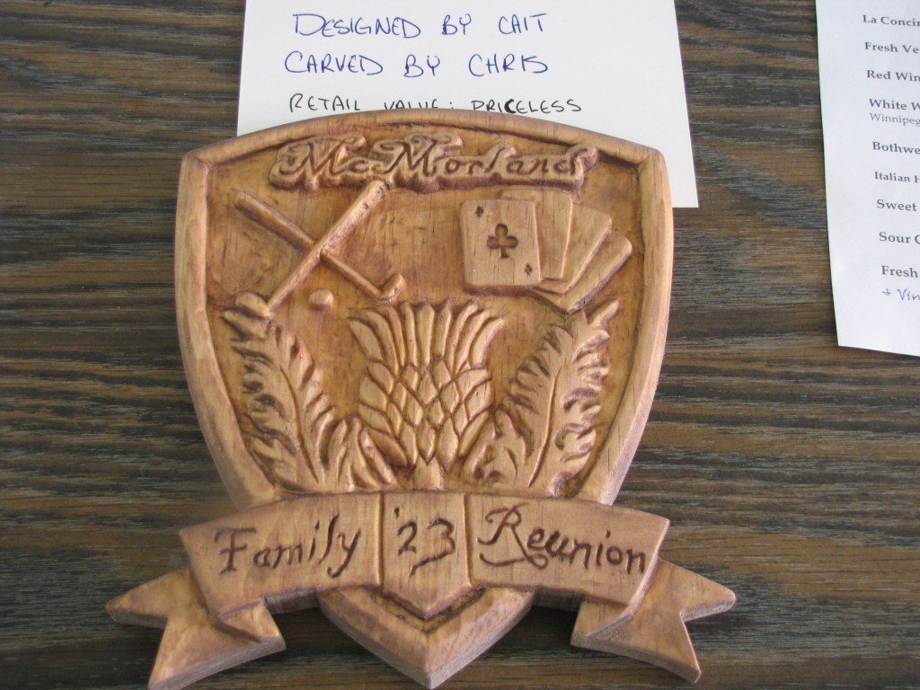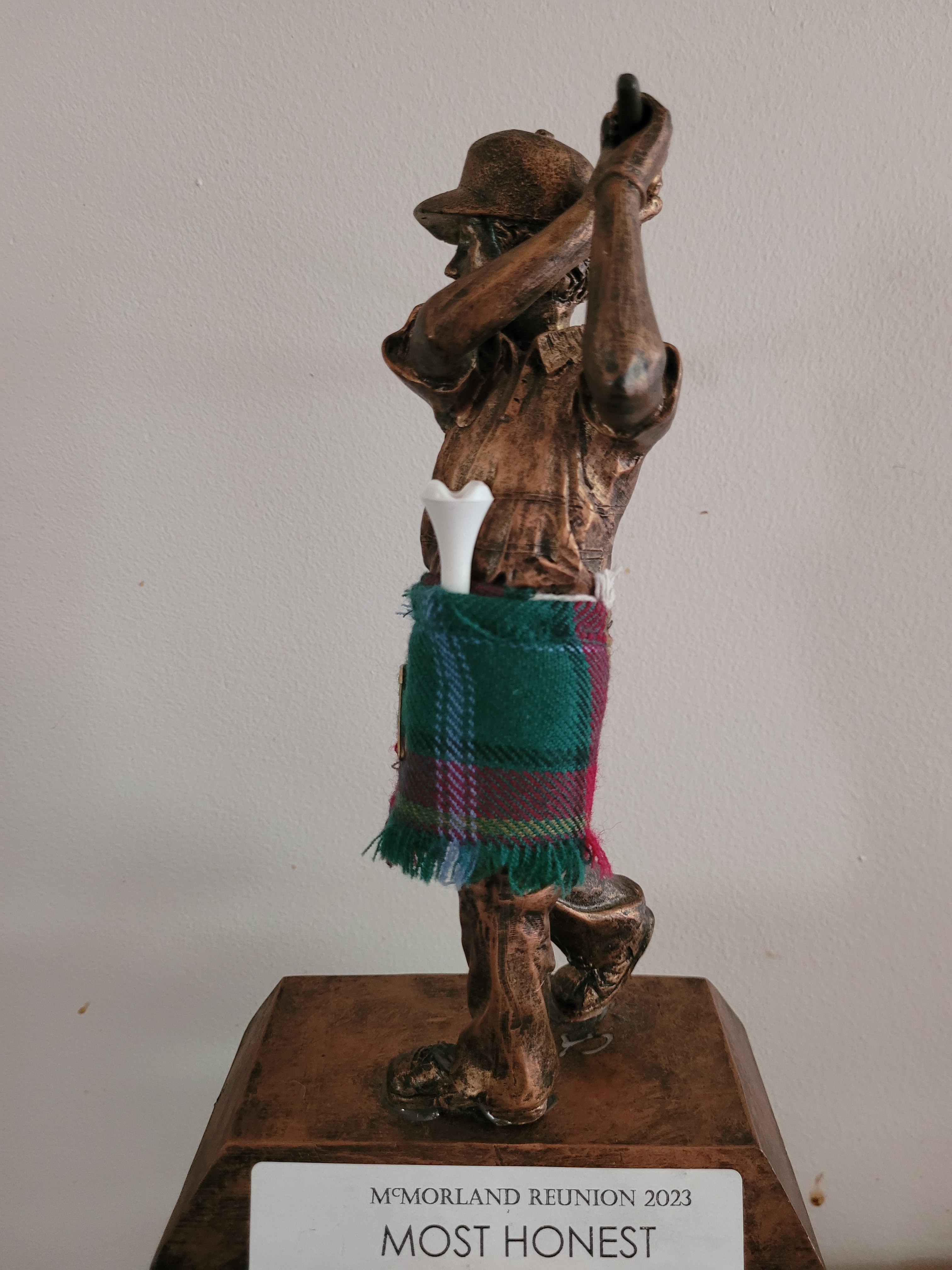 When the golf prizes were handed out that evening—Jack won a prize for being the most honest as he thought he had the shortest drive on the first hole, when in fact it had gone out of bounds, under a tree. The trophies, were some of Andy’s which we re-purposed, with labels, as well as the addition of Manitoba tartan kilts on each of the golfers.