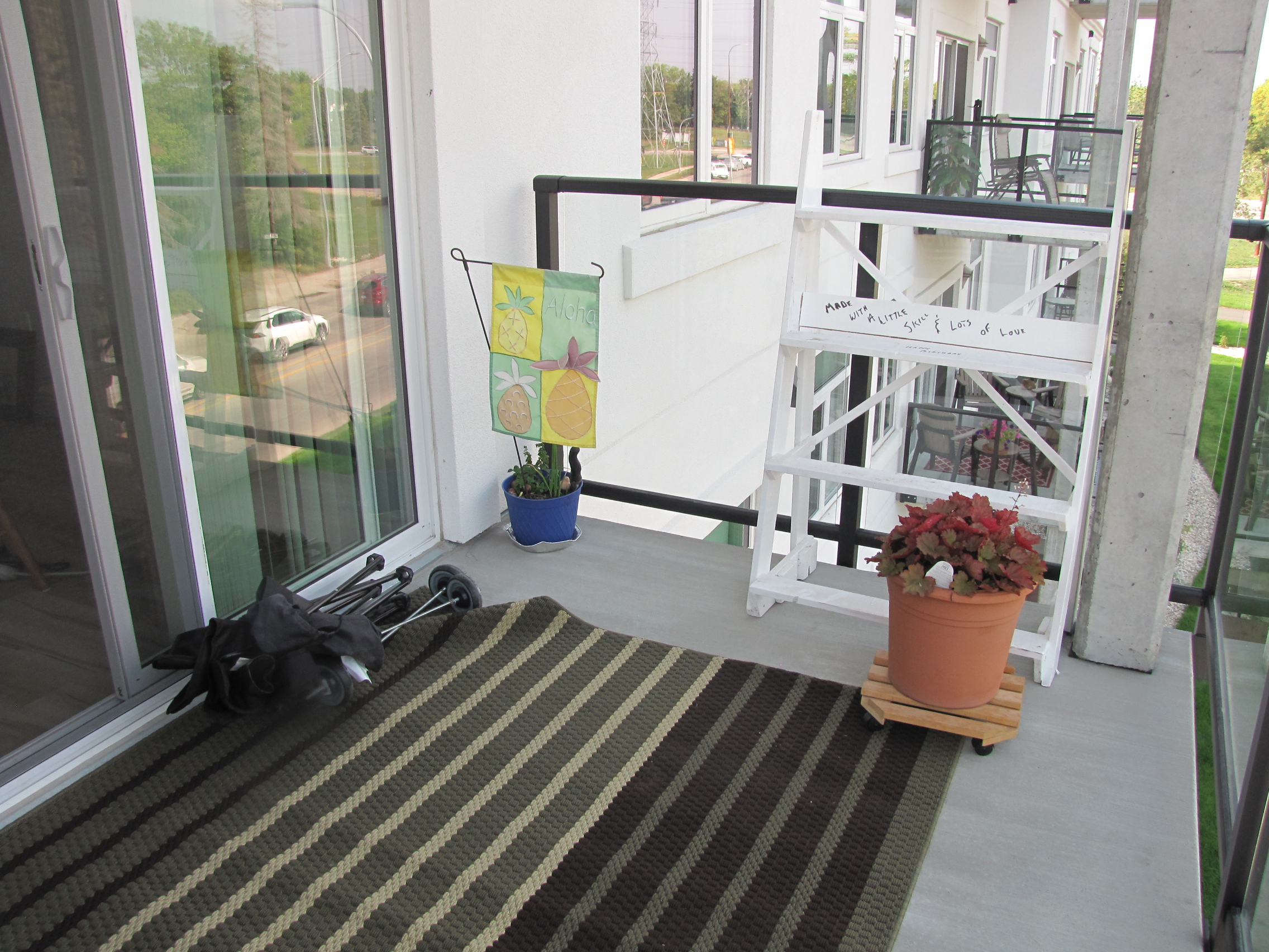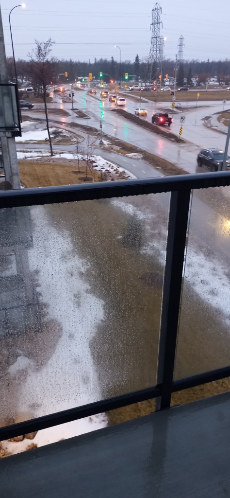 We had a fairly busy fall and winter. We participated in 2 person stick curling after Christmas. I’m saying I participated, as I really couldn’t figure out how to throw my rocks using the stick to have them end up where the skip wanted them. Needless to say, there weren’t many W’s beside our name! We had a relatively mild winter here—here’s a picture from our balcony on my birthday in February—it was raining, first time that ever happened in Winnipeg.