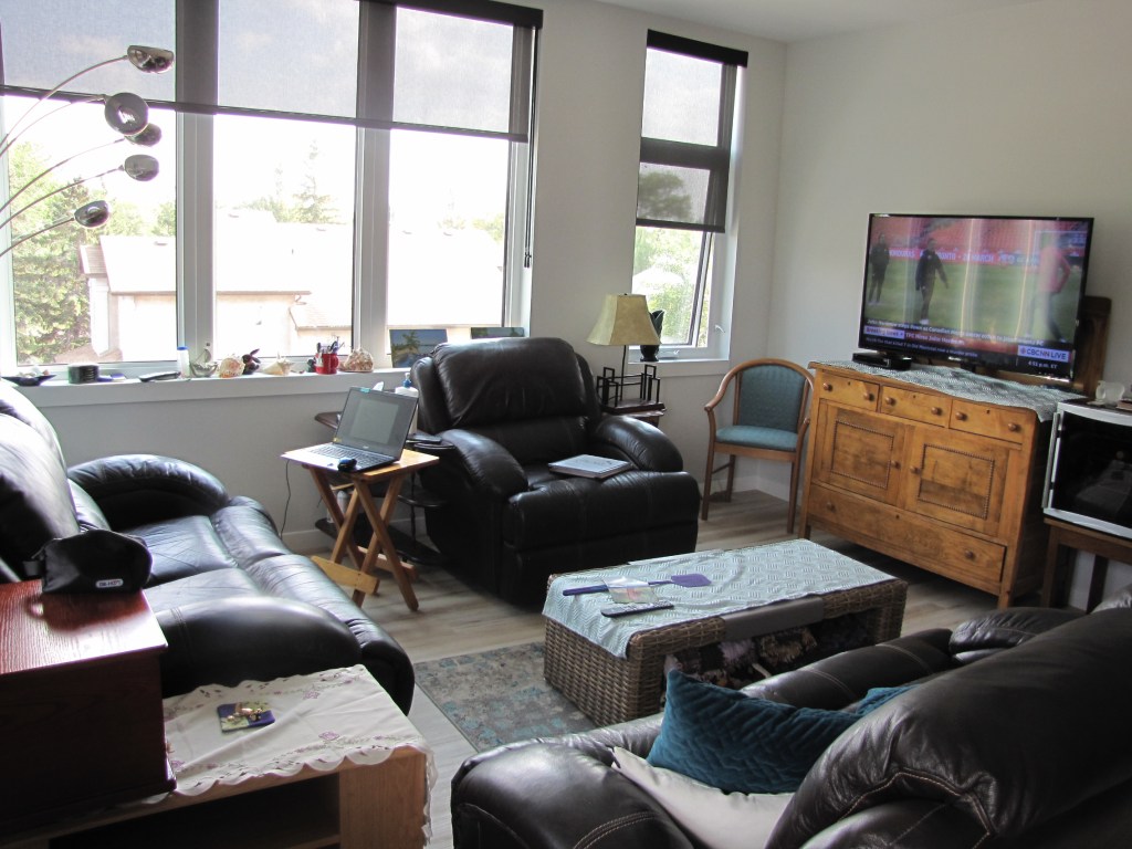 By 2:00, I was on my bike and pedaled the 2 Km to our apartment. On Friday, our internet and TV was installed in the morning. In the afternoon, Erin dropped Jack off, to help with the final adjustments on our bedroom suite, as well as adjust the air vents in the ceiling, that only someone over 6 feet tall could do. He became our first overnight guest, and slept on one of the loveseats. On Saturday morning around 8:30, both our internet and TV stopped working. After numerous call, to Bell MTS, we finally got a person who could fix it, saying that the installer had missed a critical step the previous day. Our next issue was having our email addresses transferred to the new account, this needed escalation to a case manager and programmer in order for this to be done, and took most of the day. For a communications company- Bell MTS is not very efficient. Saturday afternoon, we went to our old neighborhood and dropped off some empty packing boxes for our neighbor, while I was visiting with another neighbor, Andy took our old MTS equipment to Canada Post to be returned. On Sunday and Monday, the unpacking continued, we both went to the gym located on our floor for a short workout, and went down and met the property manager. It is now Tuesday, and we have been here for a full week, most of our things have found a home, or are living in the 2nd bedroom.